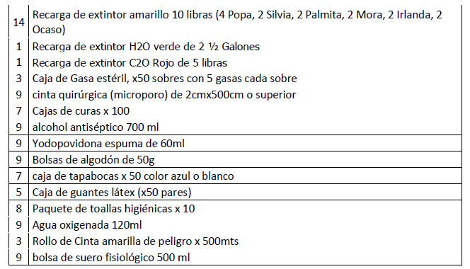 Objeto del contrato: Compra de elementos de botiquín, primeros auxilios, señalización, bioseguridad y recarga de extintores para dotar a las 6 sedes de la Institución Educativa LA POPA.