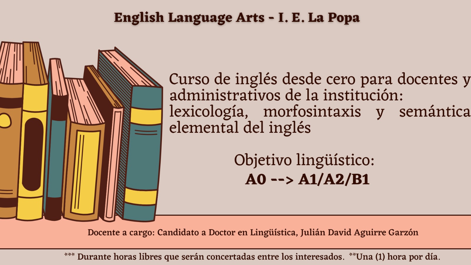 La Institución Educativa La Popa inició un curso de inglés desde cero dirigido a docentes y personal administrativo, con el fin de fortalecer sus competencias lingüísticas en lexicología, morfosintaxis y semántica elemental del inglés.